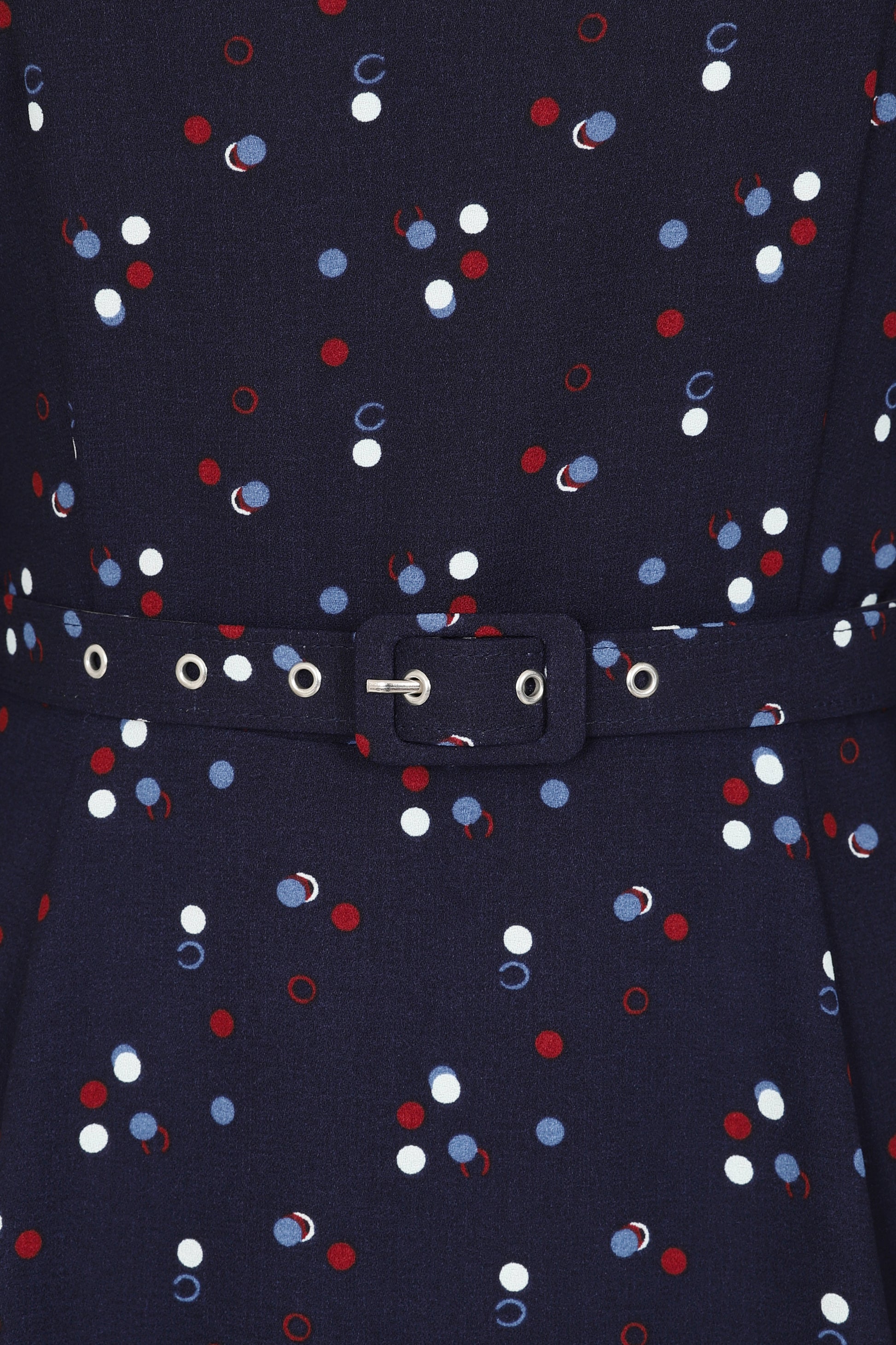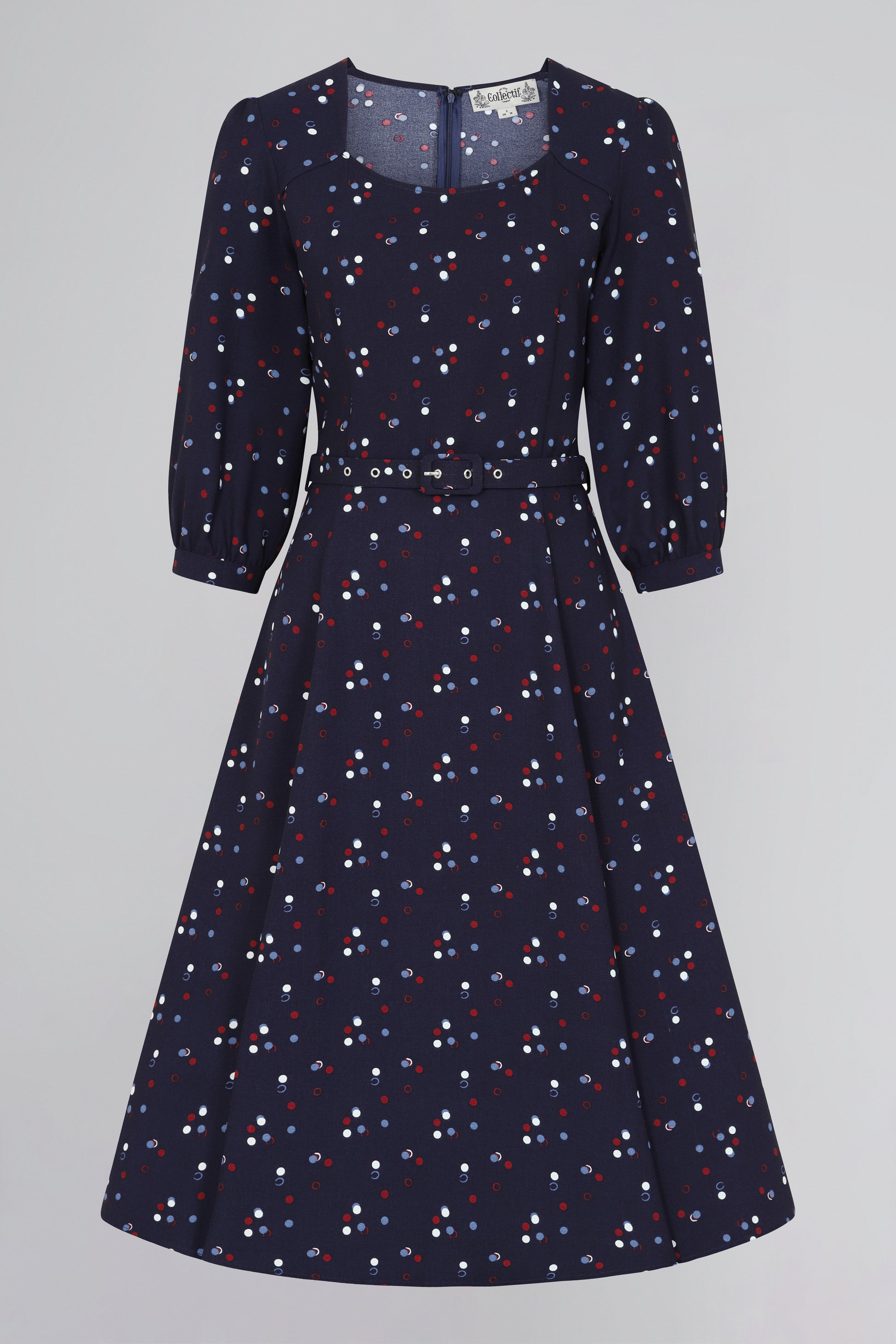 The latest Emmalyn has landed. Evoking the colours of a vintage summer, this piece is created in the stunning new Chalk Polka bespoke print, which is a navy master crepe effect fabric base with delicate red, white and light blue dots. This shape features a slightly scooped neckline and blouson sleeves that fasten with a little button just below the elbow. The A-Line flowing skirt is cinched at the waist with a matching fabric belt and sits just over the knee. The Emmalyn Chalk Polka Flared Dress fastens at the back with a covered zip. Approximate Total Length (Size 10): 110 cm / 43.30 inches Fit advice: Fit is true to size Fabric: 100% Polyester Washing Advice: Machine Washable at 30 Degrees