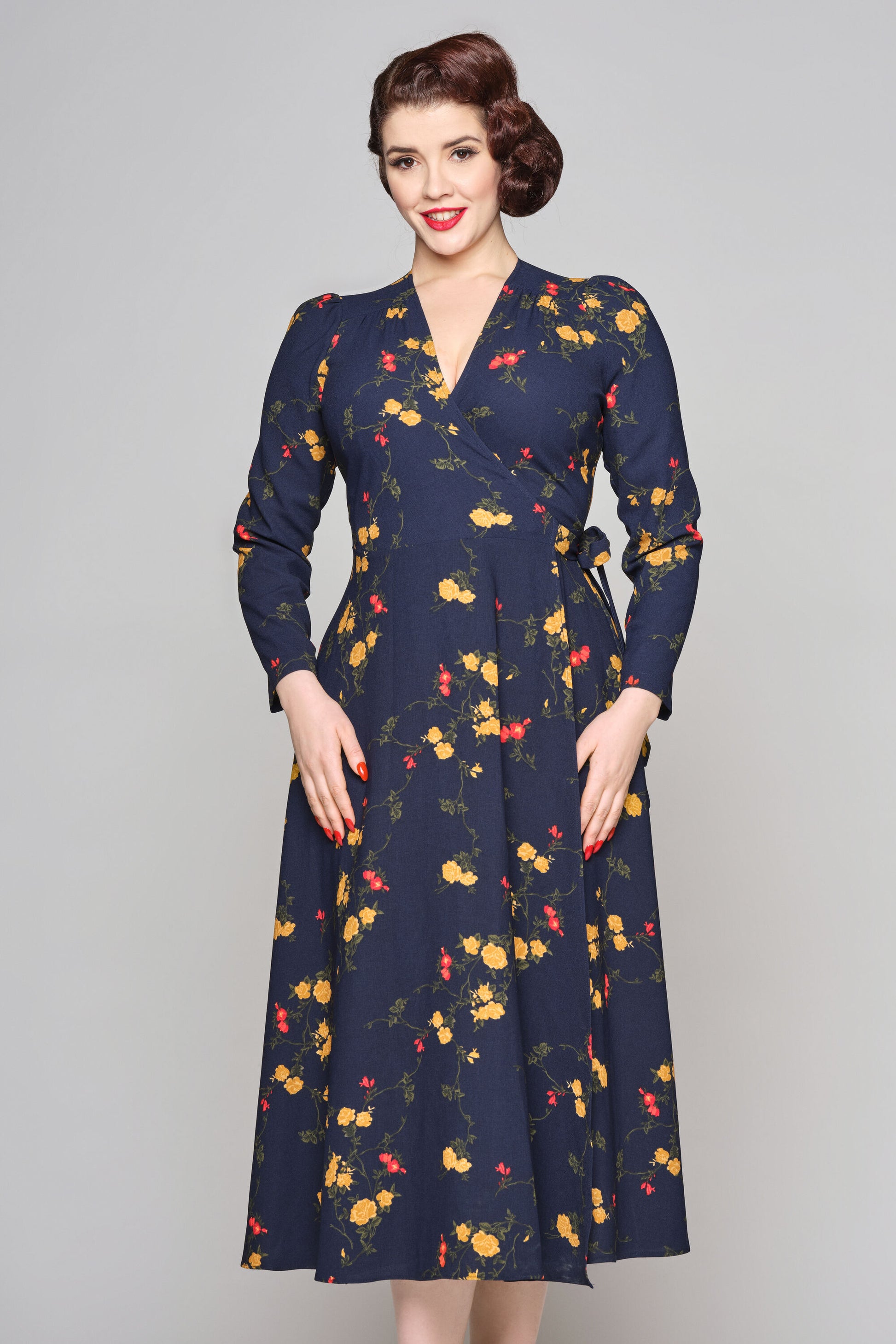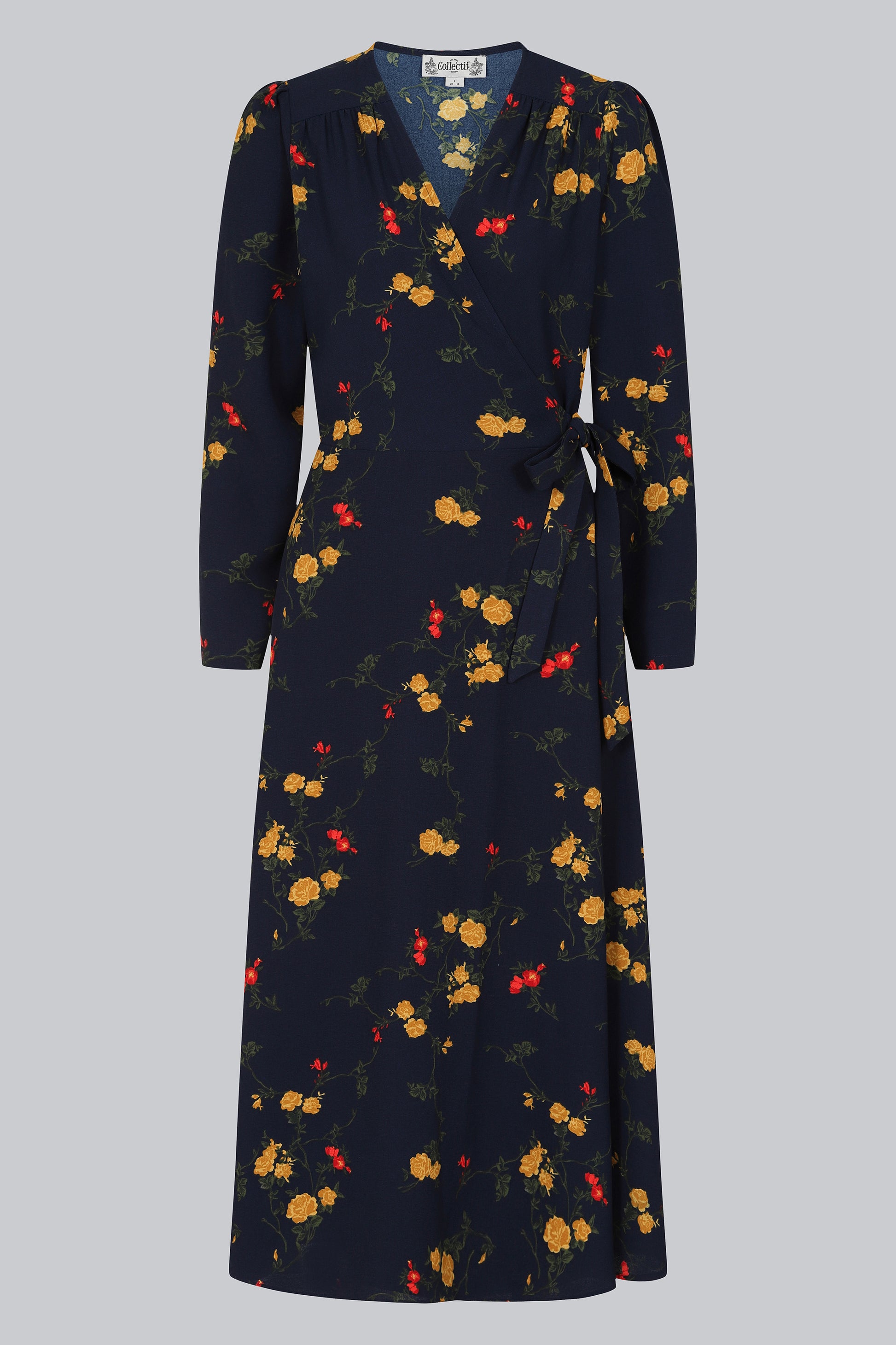 Feel comfortable and stylish in the Kendra Winter Bloom Wrap Dress. With a self-tie belt, full length sleeves and long length skirt, make a vintage statement this season. The new Winter Bloom print features a navy base with delicate mustard and red blooms. The styling opportunities are endless! Approximate Total Length (Size 10): 124.5 cm / 49 inches Fit advice: Fit is true to size Fabric: 100% Polyester Washing Advice: Machine Washable at 30 Degrees