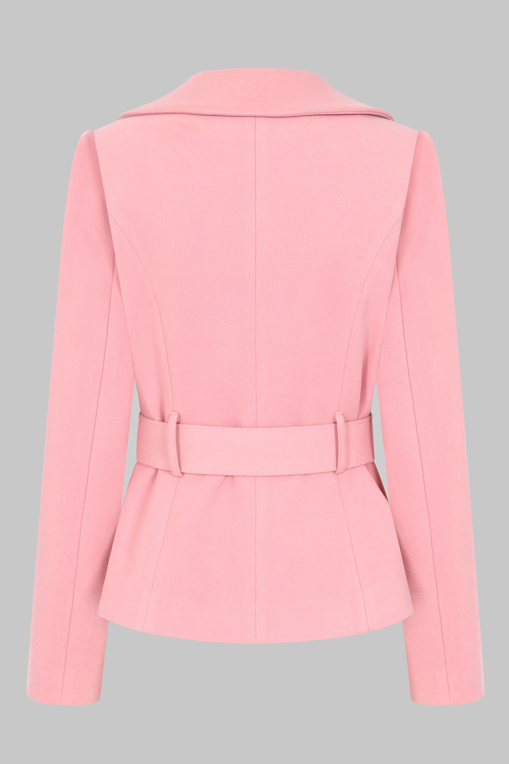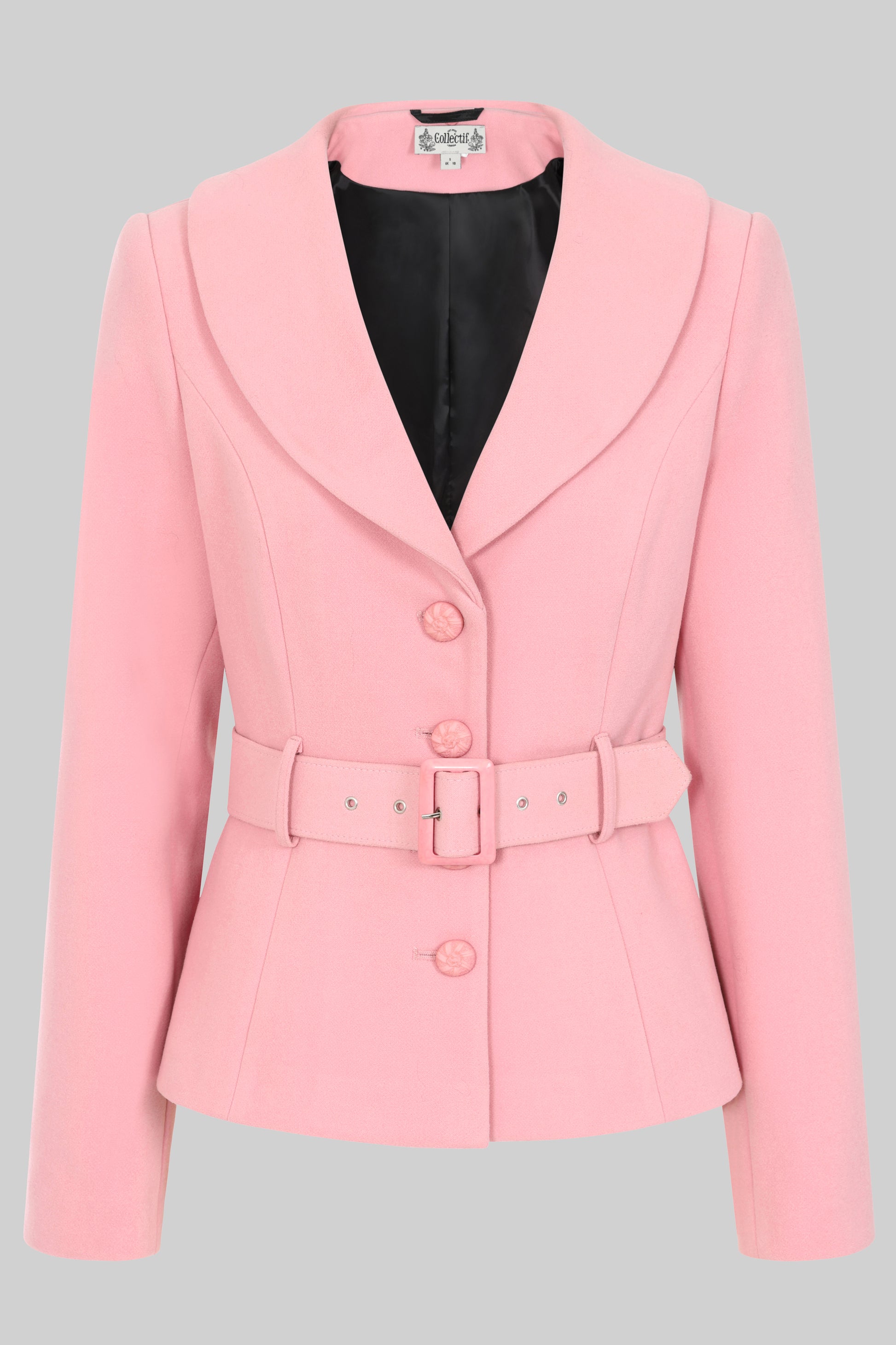 The Molly Jacket is a beautiful 40s inspired piece, perfect for the chillier days approaching. She is a hip length jacket, with full length sleeves, and sturdy belt. Molly is made in a classic olive green, luxurious wine coloured wool blend or pink, with a detachable black faux fur over collar, and bespoke floral satin lining. She fastens at the centre front with four vintage style gunmetal buttons and matching colour belt buckle and prong. Wear with our green trousers for a smart two piece, or wear with our vintage inspired jeans to dress down for the weekend. Fit is slim cut for a pin-up silhouette . If you wish to wear over layers, we recommend sizing up. Approximate Total Length (Size 12): 23 inches Fabric: 62% Polyester 33% Viscose 5% Elastane Lining: 97% Polyester 3% Elastane Fur: 80% Nylon 20% Polyester Washing Advice: Dry Clean Only. Do Not Iron.