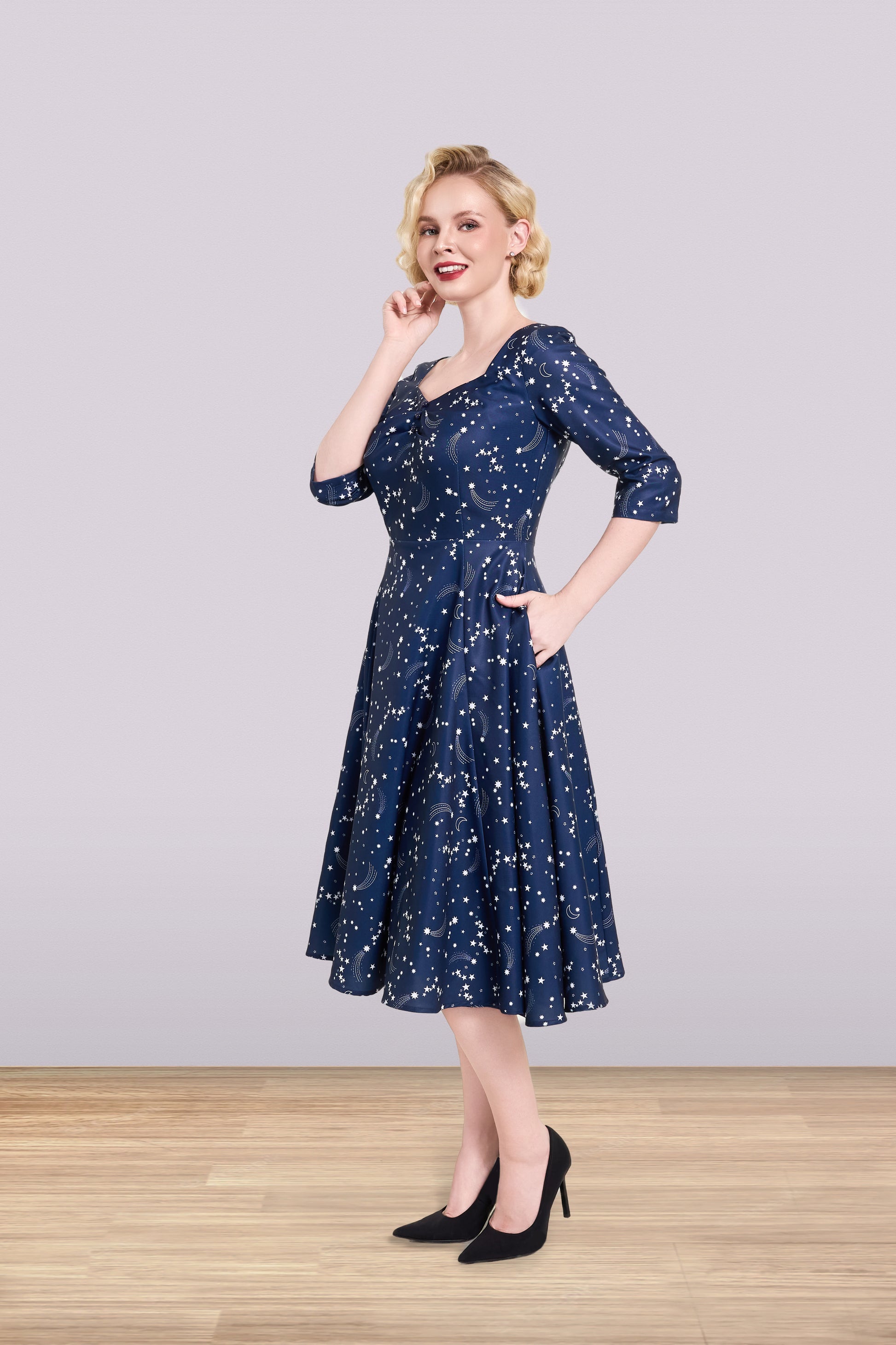 The Linda Stars Dress celebrates your individual style with its charming vintage aesthetic and thoughtful design details. Three-quarter sleeves provide comfortable, flattering coverage for any season, while the coordinating belt empowers you to customize your silhouette and express your personal flair. Adorned with delicate star motifs, this dress supports your confidence with a timeless look that honors classic femininity and makes you feel genuinely beautiful. 100% Polyester