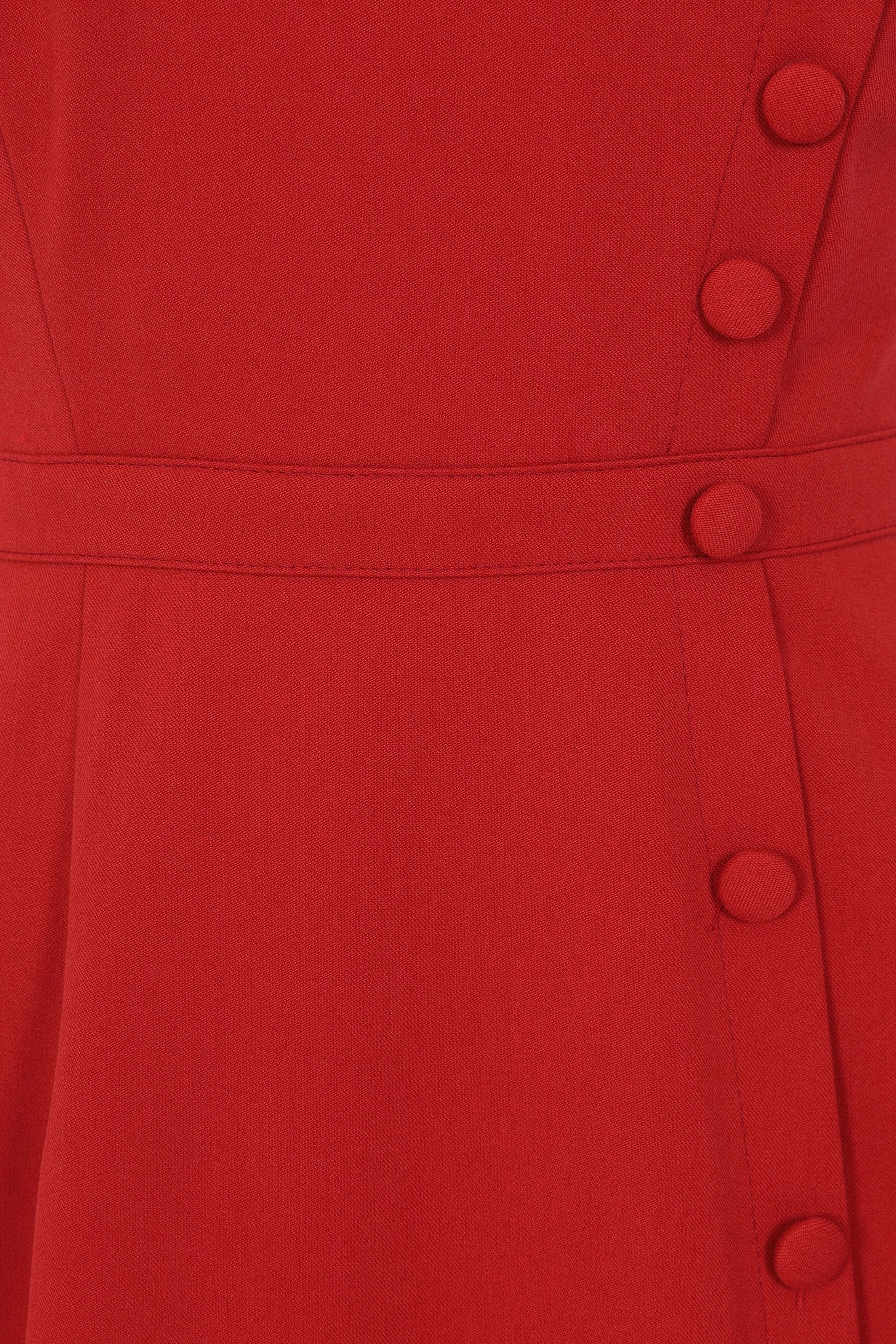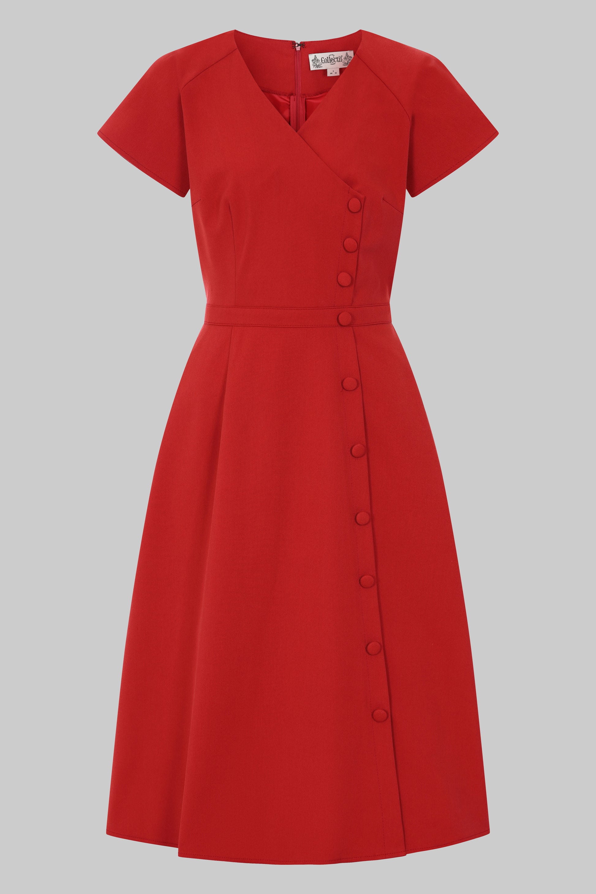 The Cherylin Plain dress is a new addition to the tailored capsule collection. This 40s A-line dress has a soft crossover bodice and asymmetric decorative buttons from bust to hem. The twill blend fabric in red gives a glorious vintage style drape, and concealed back zipper and side seam pockets provide a sleek silhouette. Approximate Total Length (Size 10): 111 cm / 43.70 inches Fit advice: Fit is true to size Fabric: 38% Polyester 34% Viscose 25% Res 3% Ela Washing Advice: Machine Washable at 30 Degrees