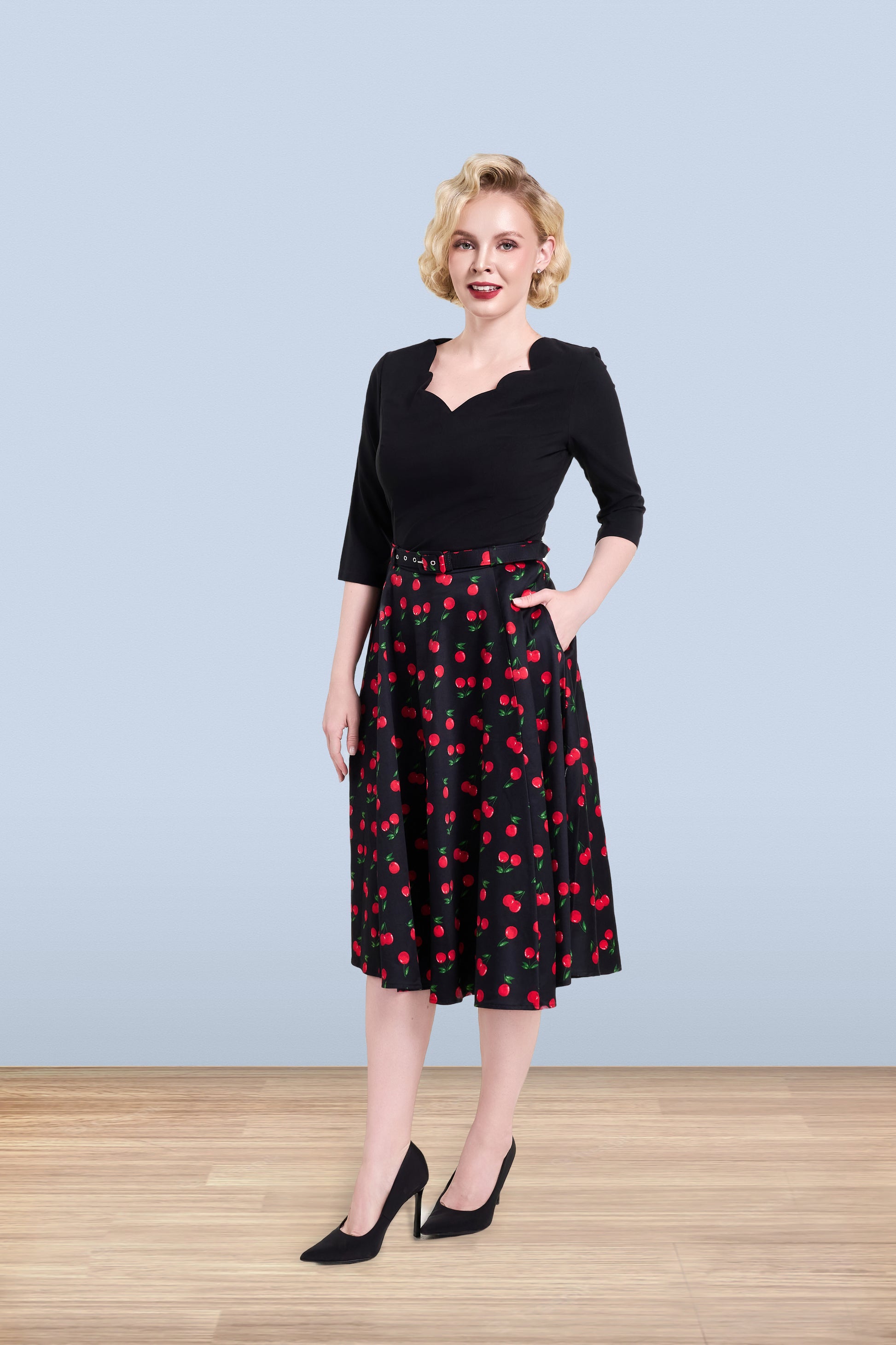 Twirl into vintage charm with the Christine Cherry Skirt! This delightful piece features a classic silhouette adorned with a cheerful cherry print that brings instant joy to your wardrobe. Perfect for creating that timeless 1950s-inspired look, it pairs beautifully with fitted tops and vintage accessories. Whether you're heading to a retro gathering or simply want to add a pop of playful personality to your everyday style, this skirt delivers sweetness with every spin. A wardrobe essential for anyone who loves nostalgic fashion with a fruity twist!