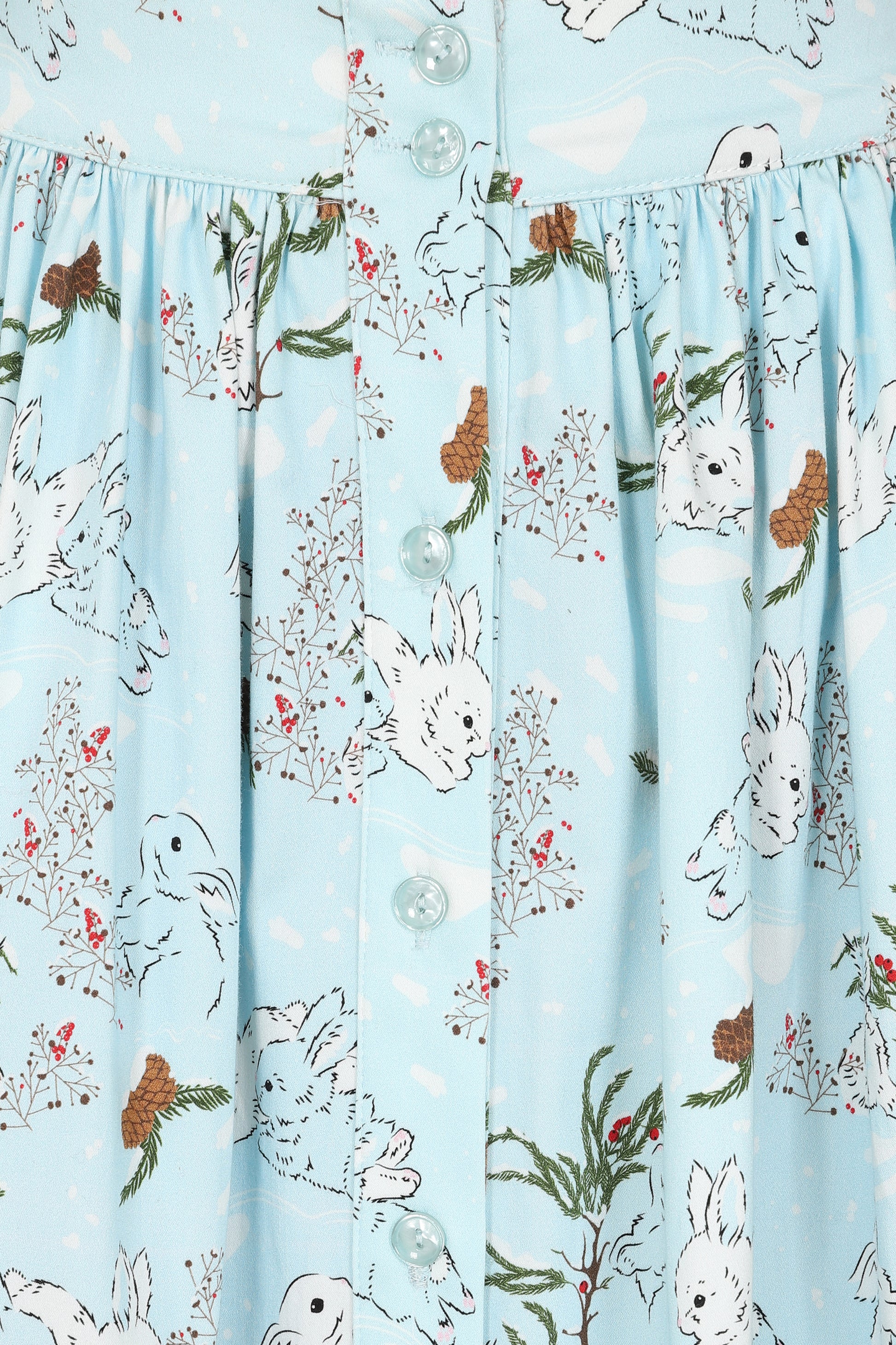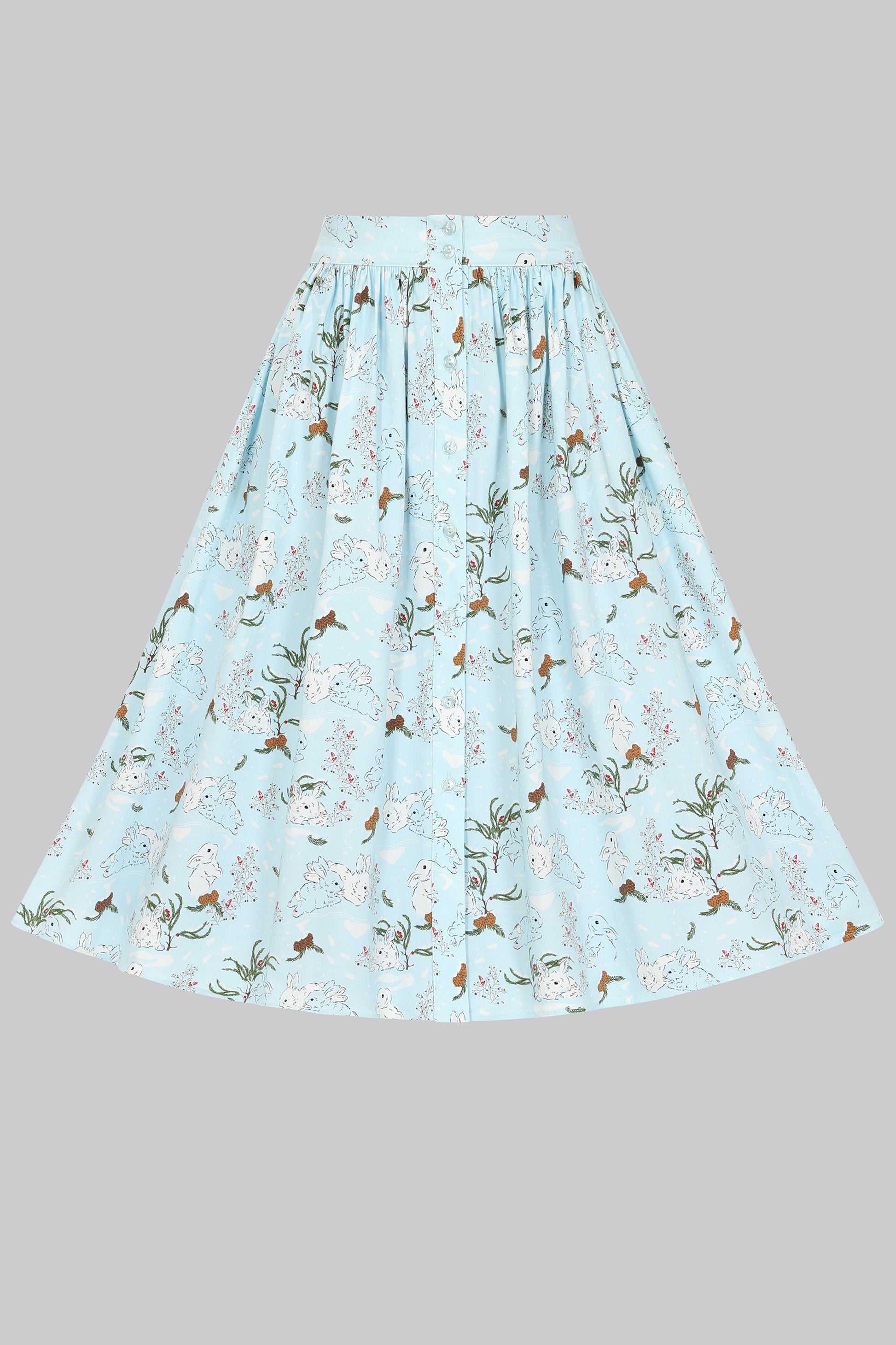 The Mariana Snowy Rabbit Swing Skirt is the perfect winter separate. With a gathered full skirt and side seam pockets, this is perfect styled with our knitted tops or cardigans. The vintage inspired print features adorable bunnies playing in a snowy scene Approximate Total Length (Size 10): 74 cm / 29 inches Fit advice: Fit is true to size Fabric: 97% Cotton 3% Elastane Washing Advice: Machine Washable at 30 Degrees
